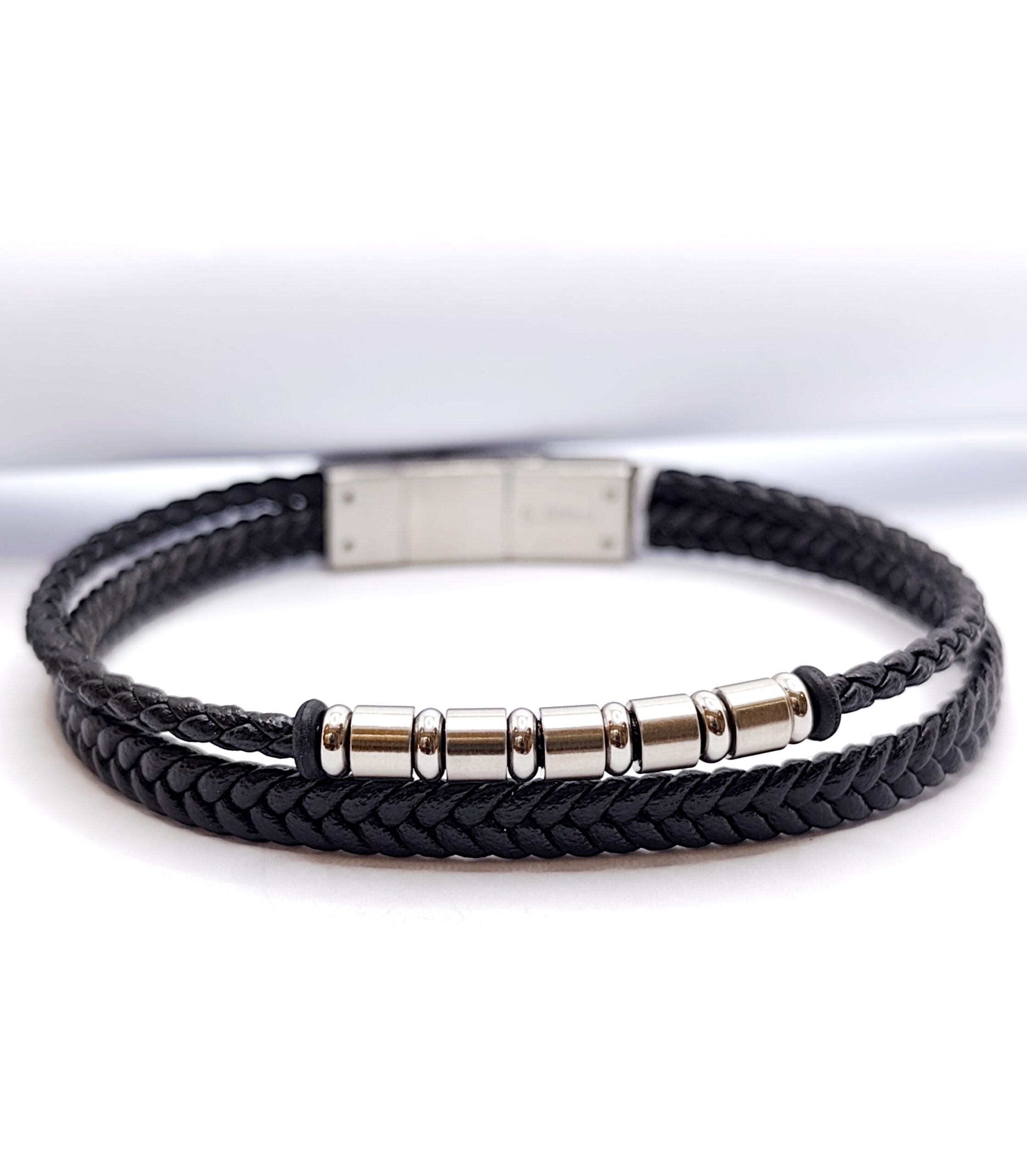 Βραχιόλι με διπλή αλυσίδα από ανοξείδωτο ατσάλι και δέρμα.