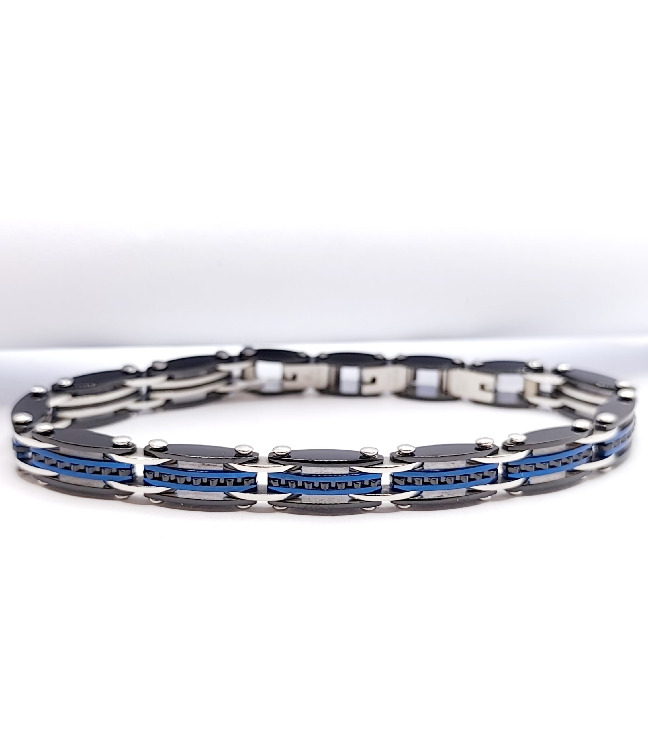 Βραχιόλι ανδρικό, από ανοξείδωτο ατσάλι, με μπλε και μαύρες λεπτομέρειες.