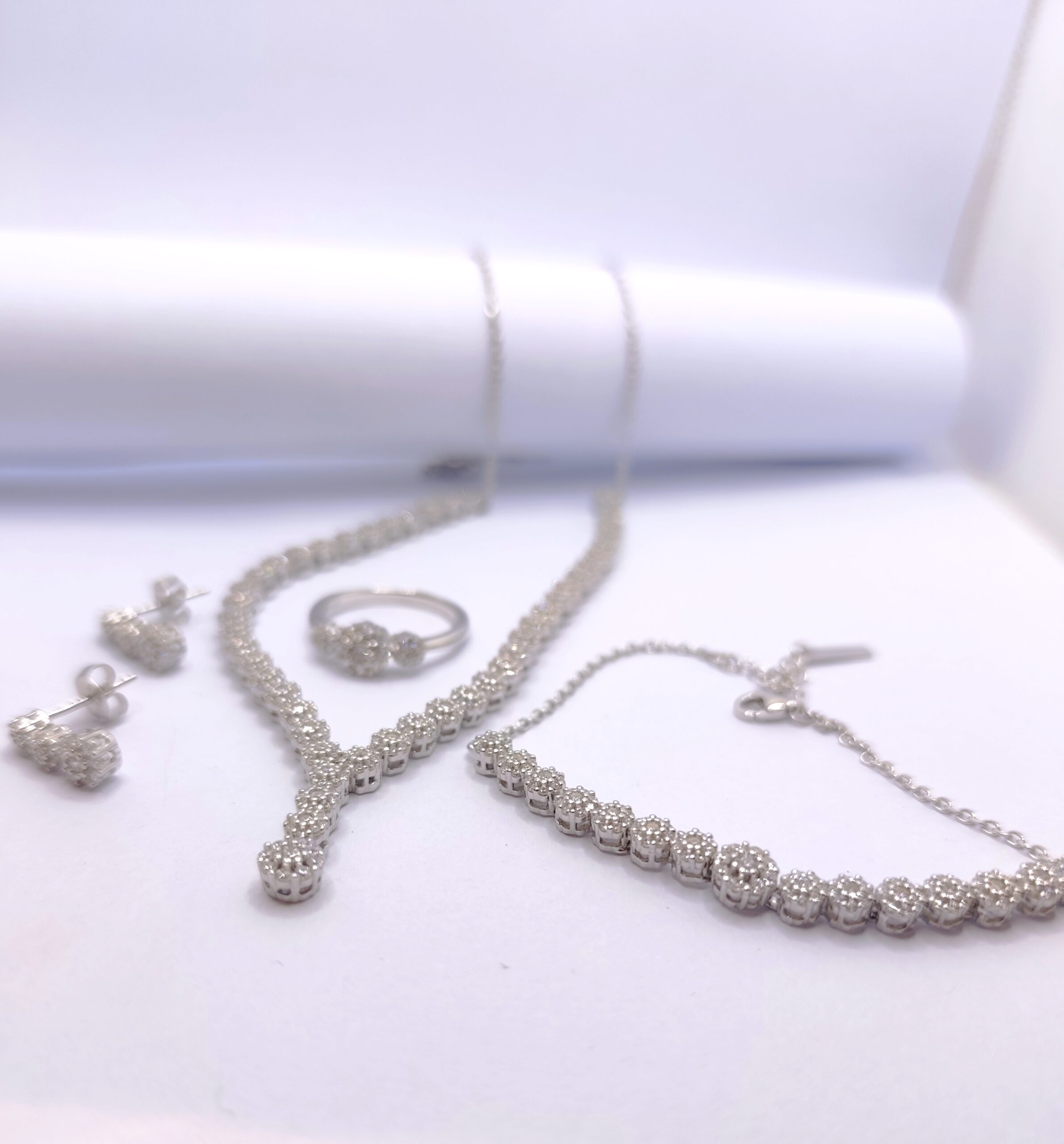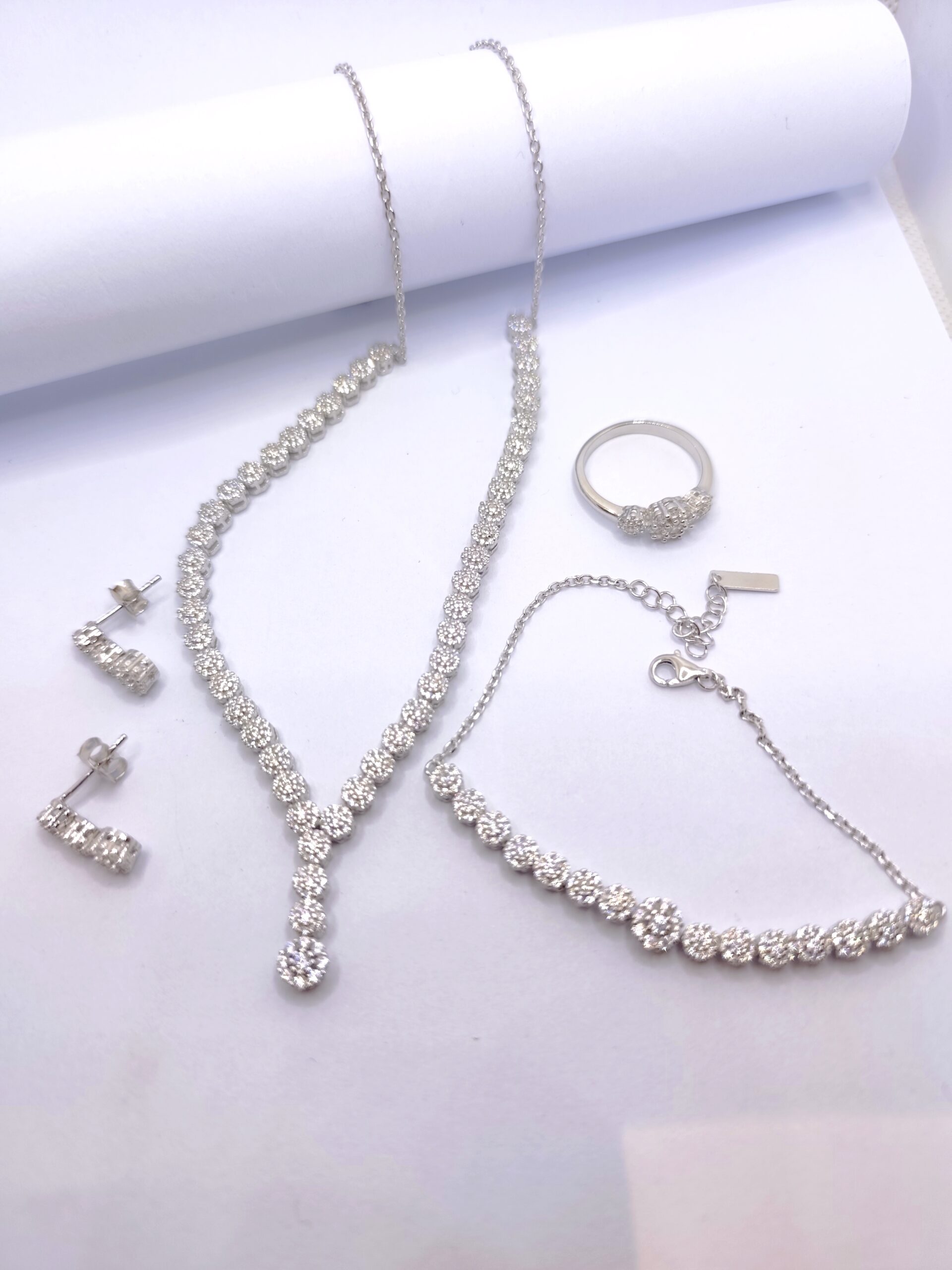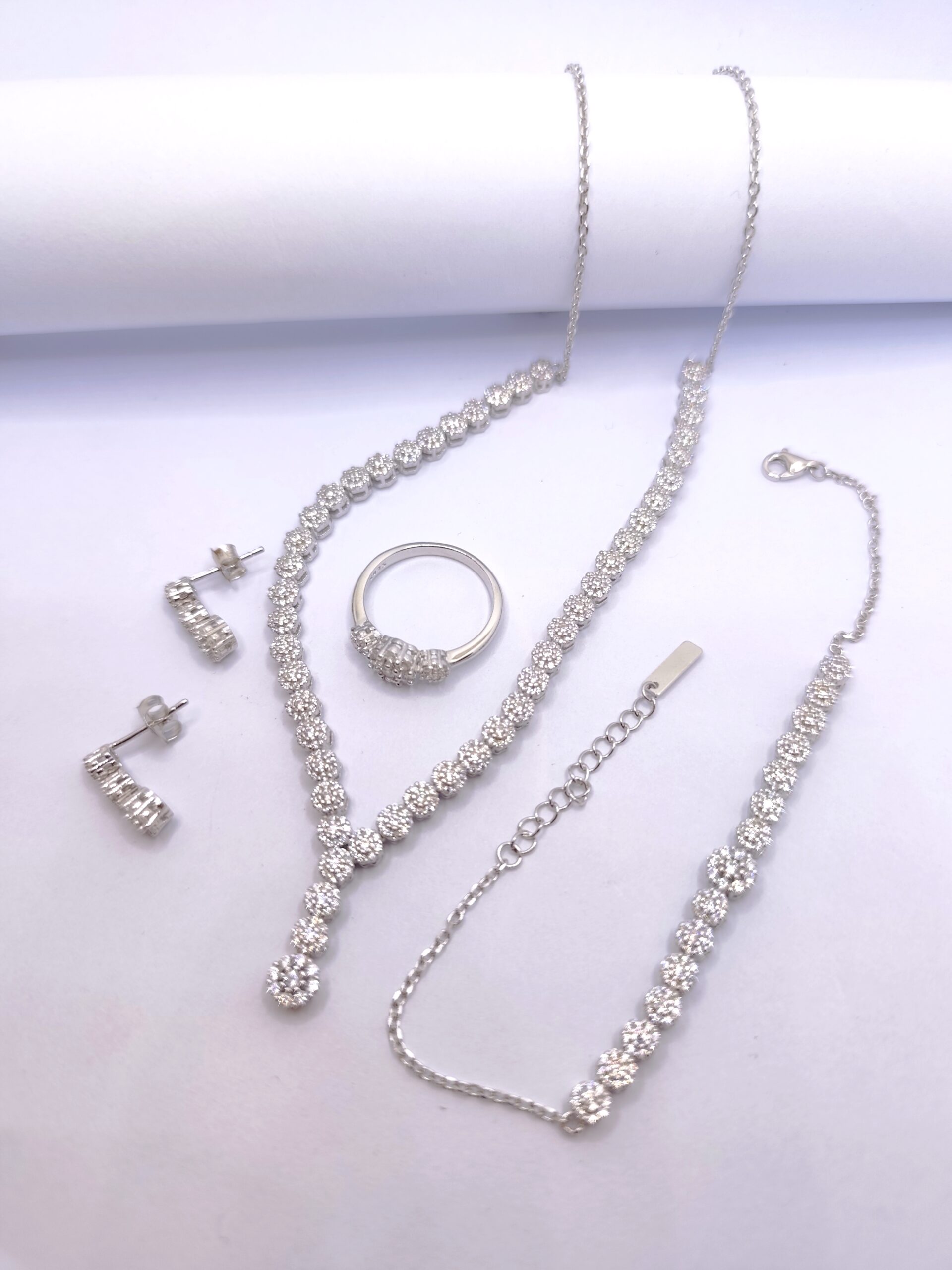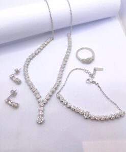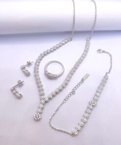 Σετ κολιέ, σκουλαρίκια, βραχιόλι και δαχτυλίδι από επιπλατινωμένο ασήμι 925 λευκού χρώματος.